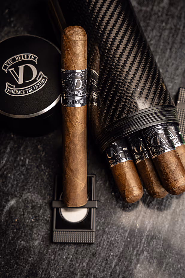 Every Vie Deluxe cigar is hand-crafted with aged, premium tobacco leaves and housed in custom carbon fiber canisters — a blend of precision, passion, and prestige.