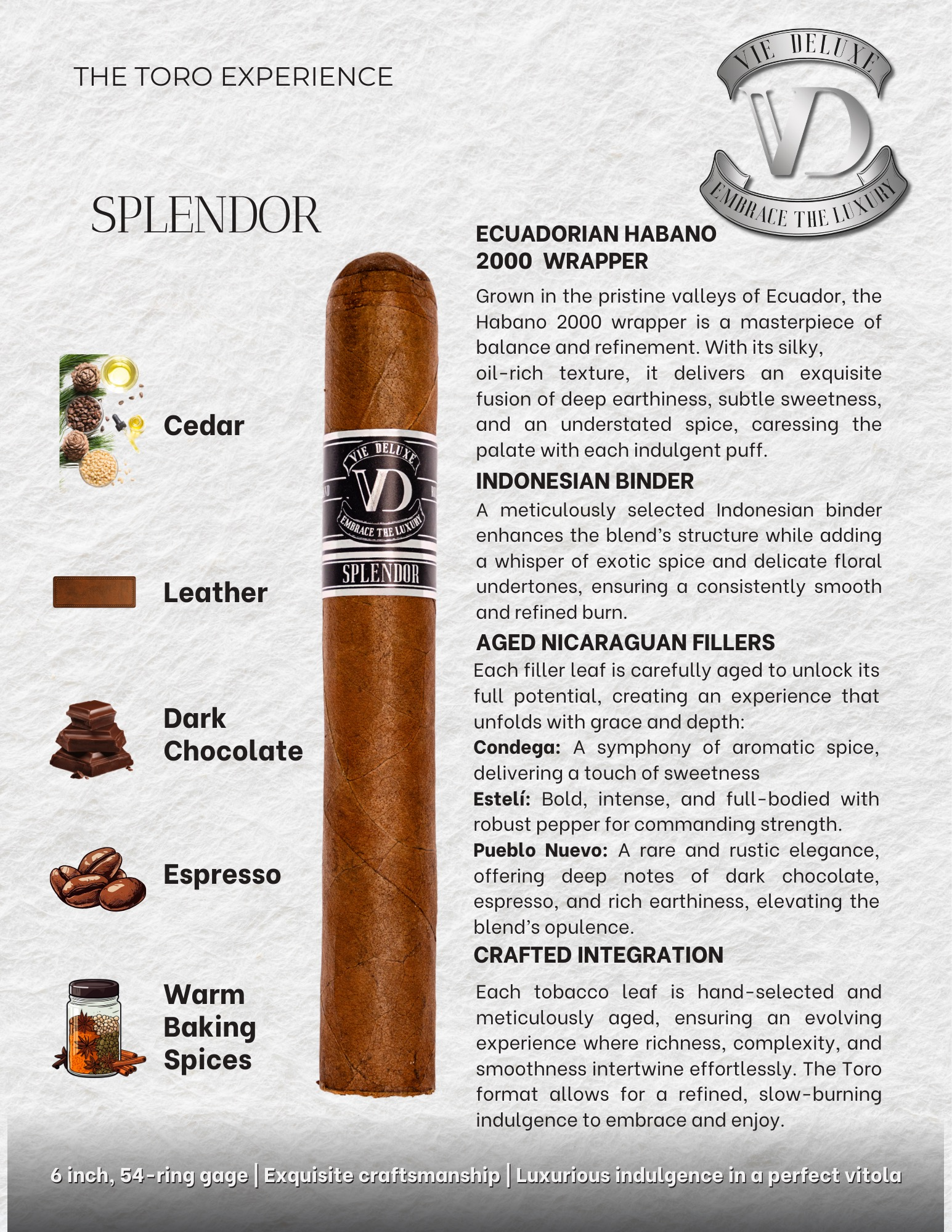 Crafted in a 6-inch, 54-ring gauge vitola, Vie Deluxe Splendor delivers a harmonious and refined smoking experience. Wrapped in silky, oil-rich Ecuadorian Habano 2000 and bound with Indonesian leaf, this Toro format allows the aged Nicaraguan fillers from Condega, Estelí, and Pueblo Nuevo to fully express their character. Expect notes of cedar, leather, dark chocolate, espresso, and warm baking spices unfolding with smooth precision — a luxurious indulgence defined by balance and depth.